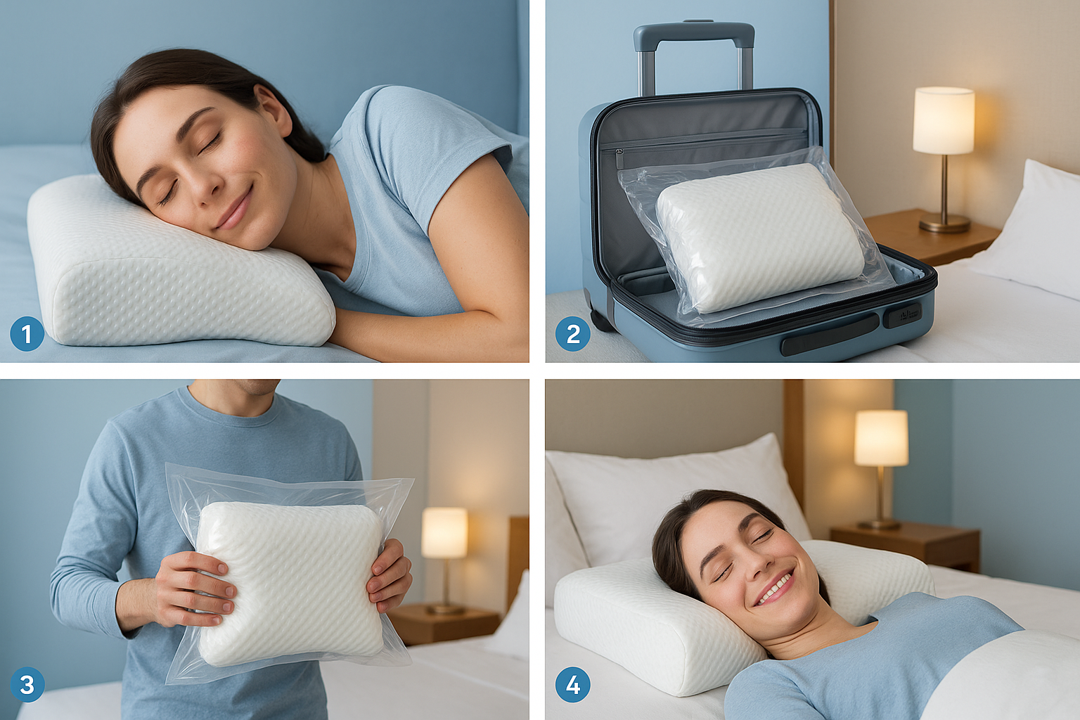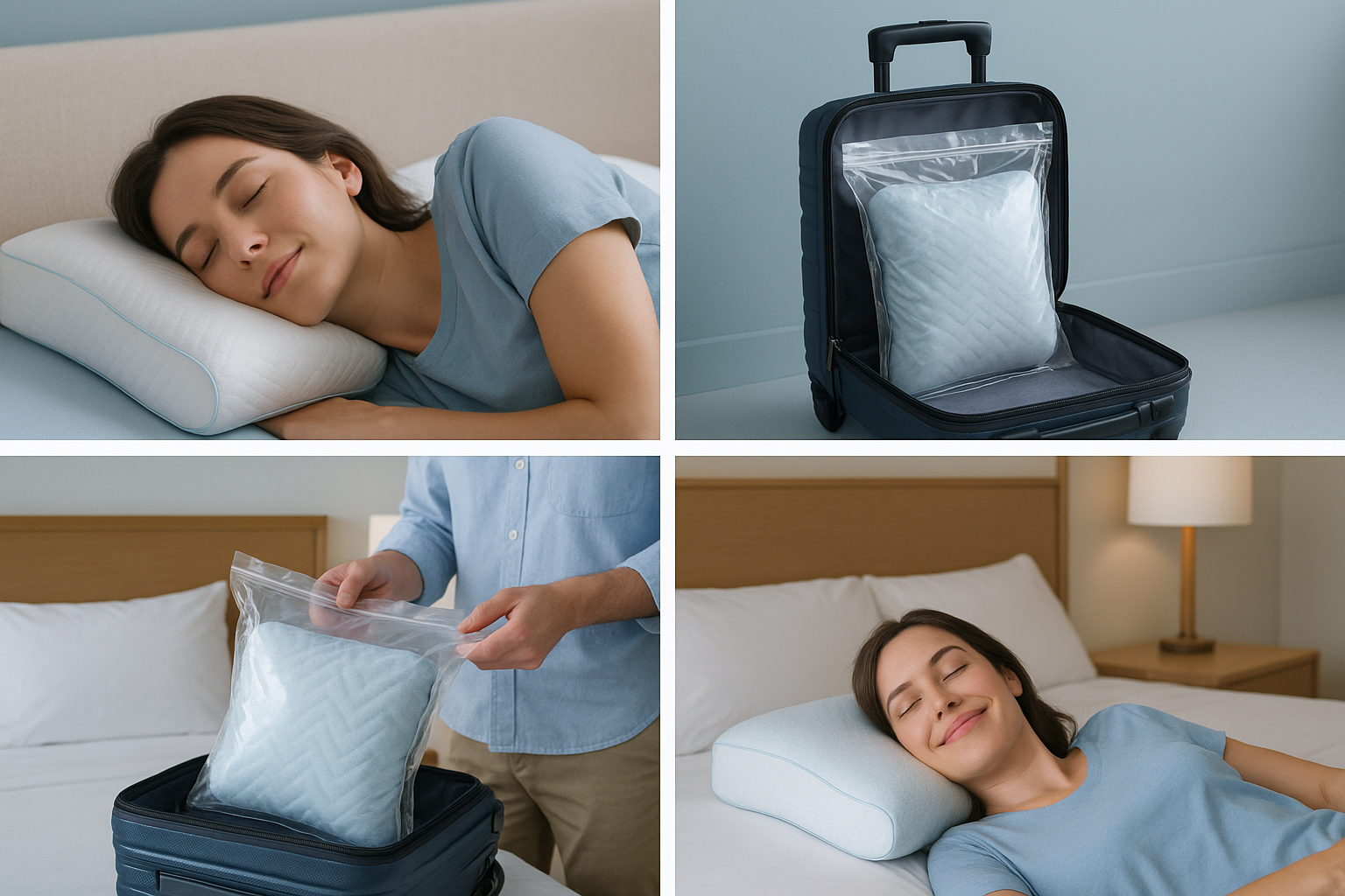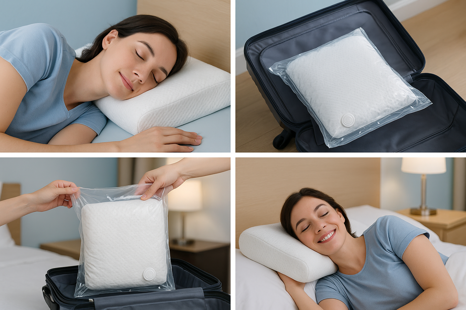 TakeMe to the Ocean. Designed for optimal support during extended, restful sleep in spacious beds, this ergonomic pillow offers comfort and practicality. It compresses up to 90% for easy travel and can be inflated or deflated in just 90 seconds.